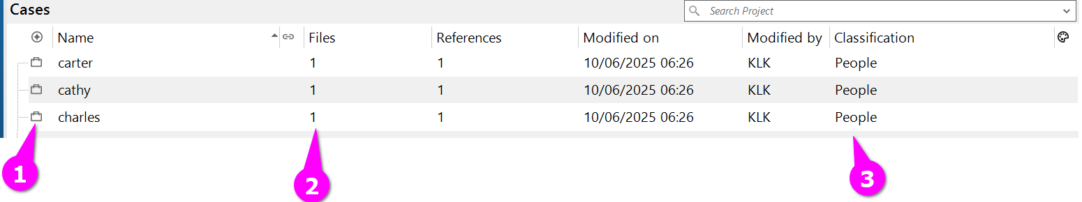 For each person, they now have a ‘case’ icon (1) and 1 file associated (the transcript) (2); they have been created under the classification ‘People’.