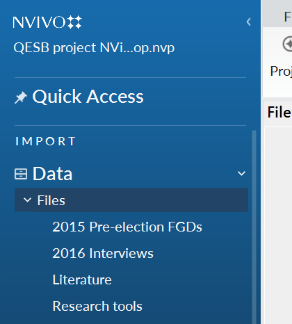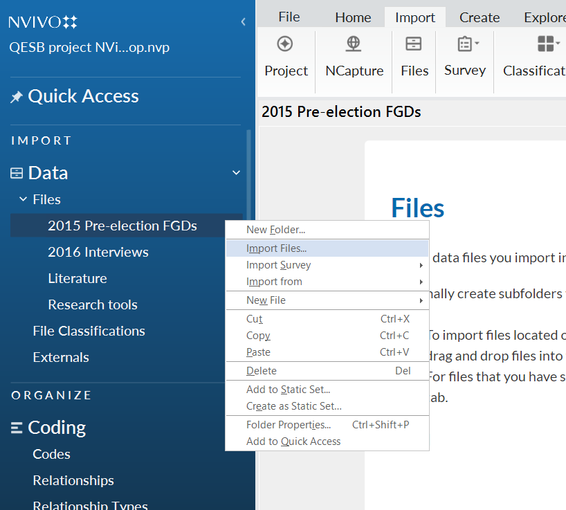 Right click on the ‘2015 pre-election FGDs’ folder in the Navigation view and select ‘Import Files’