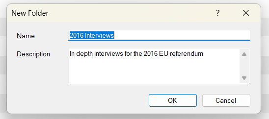 Create a new folder under files by right clicking on files, select ‘new folder’,name it ‘2016 Interviews’, add a brief description of you like, click OK to finish.