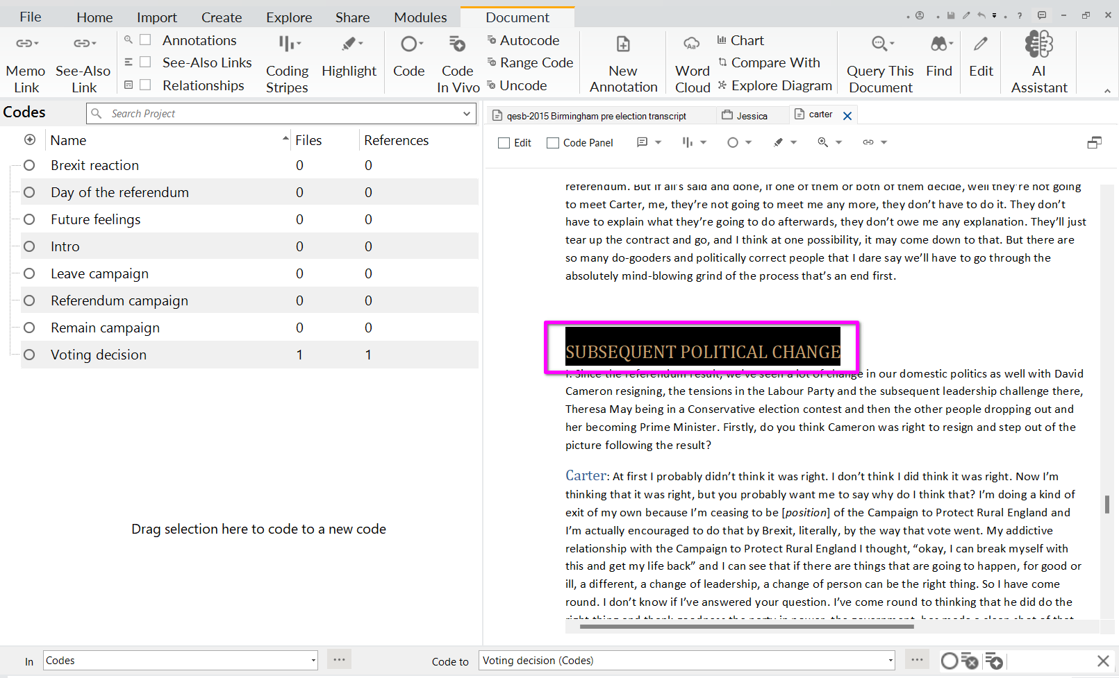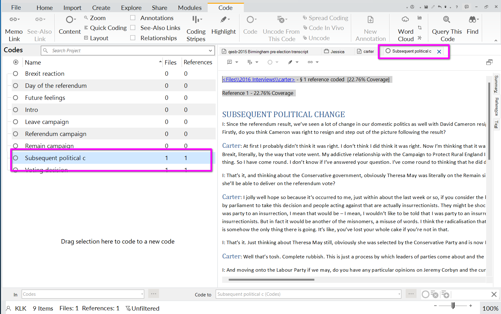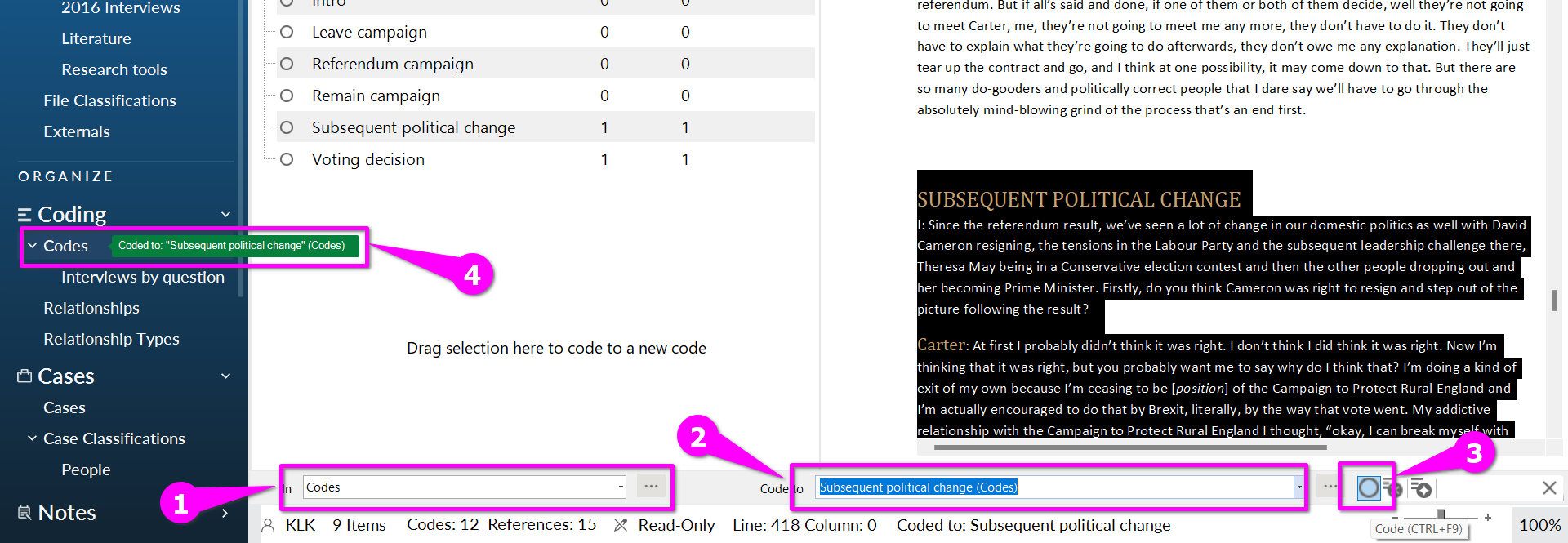 - In the section, ‘Code to:’, type ‘Subsequent political change’ then press enter (2)
