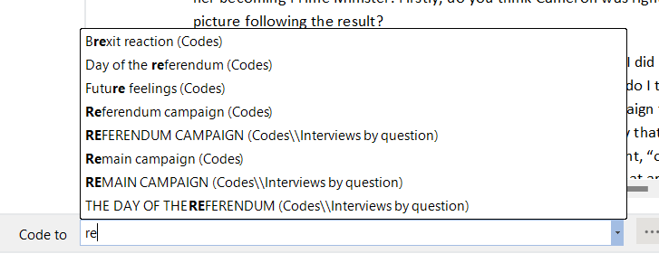 NB. You can use this coding bar to code to existing codes as well. Once you start typing in the bar, NVivo will offer you existing codes to select: