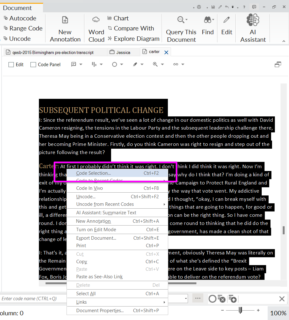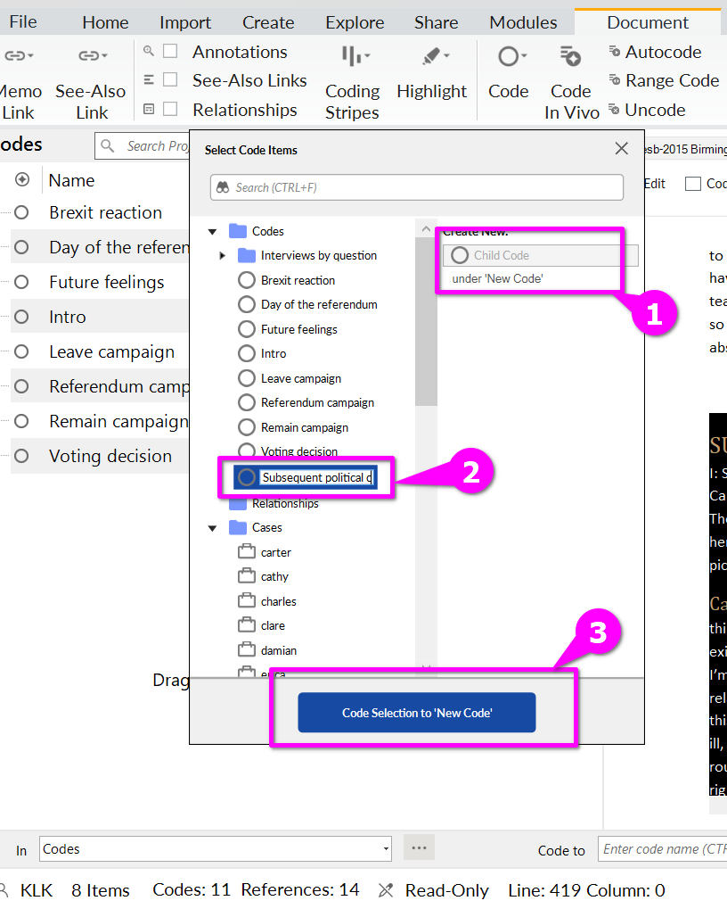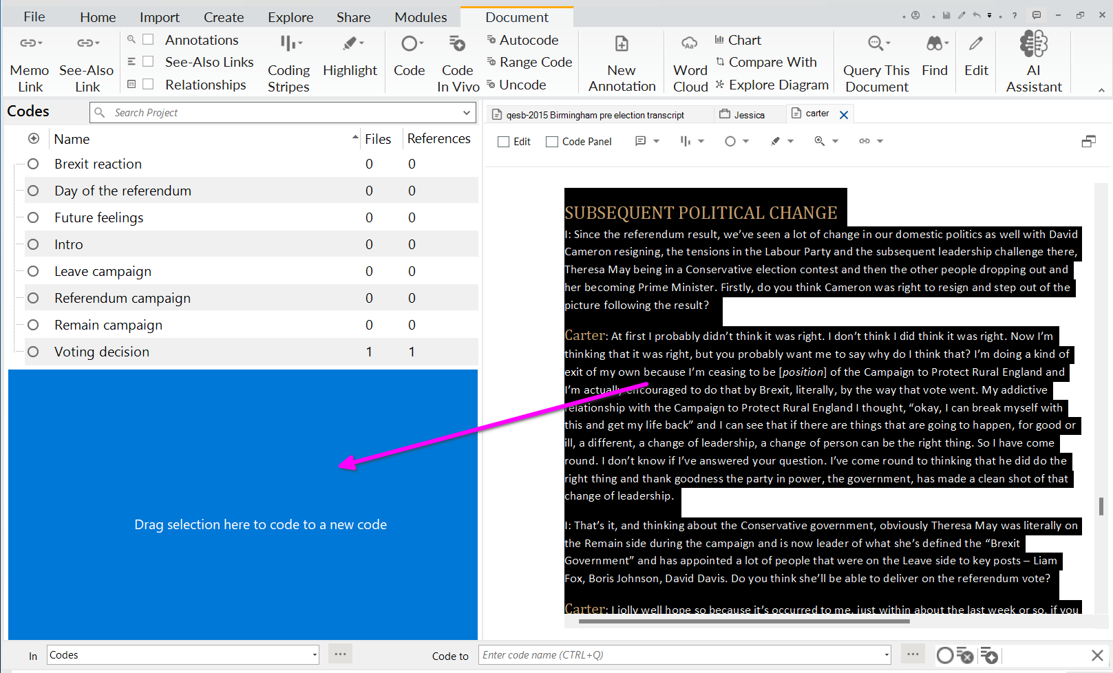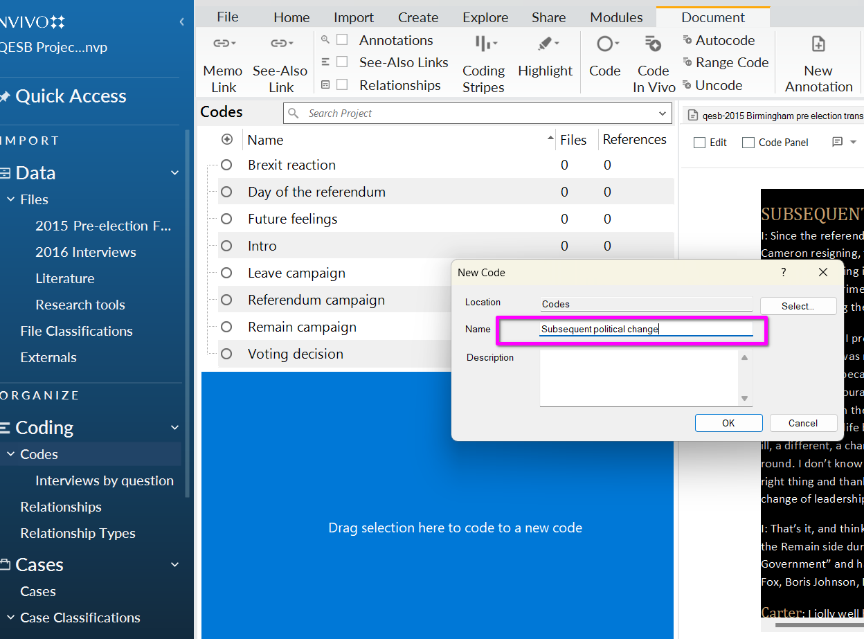 - While highlighting the text, drag and drop it into the open space below the codes to open a prompt to create a new code: