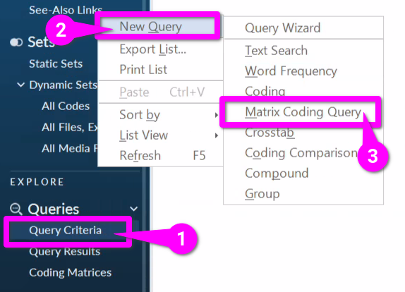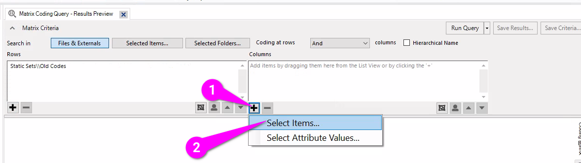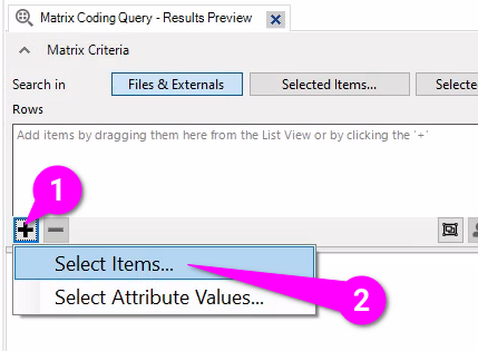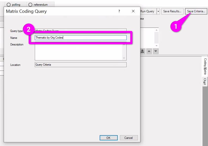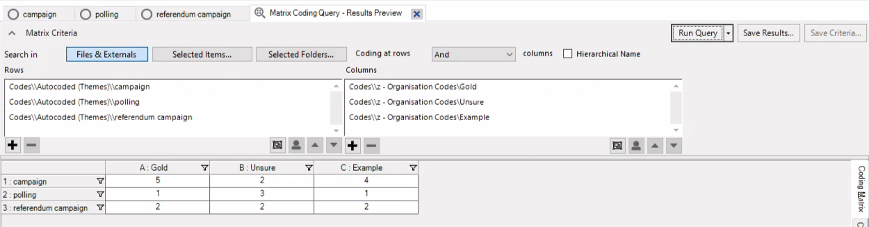 OK, lets first create a coding matrix query that finds text coded at both the thematic codes and our organisation codes.