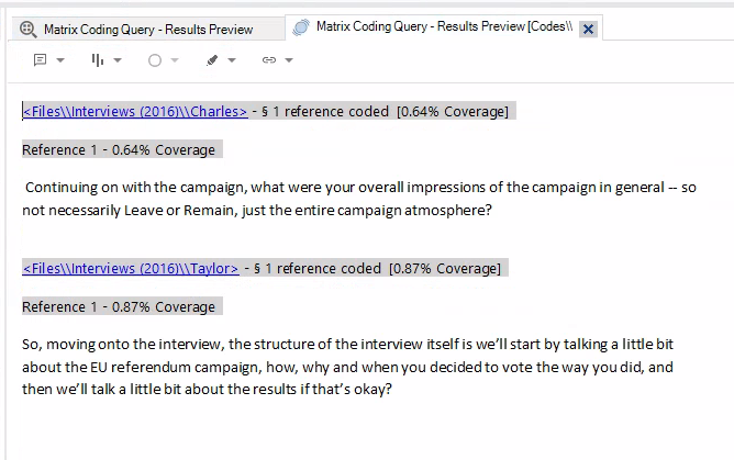 Far more important though - and not made obvious by how NVivo displays the results - is that you can double-click on any of the cells! That will open a Code Results view for all the text for that cell. So, for the coding matrix query used in the screenshot, if you click on the cell where row = campaign and column = Gold, it will open a results view showing all text coded at both campaign and Gold - in other words, all the text for campaign that we coded as potential gold for using as quotes when writing up.