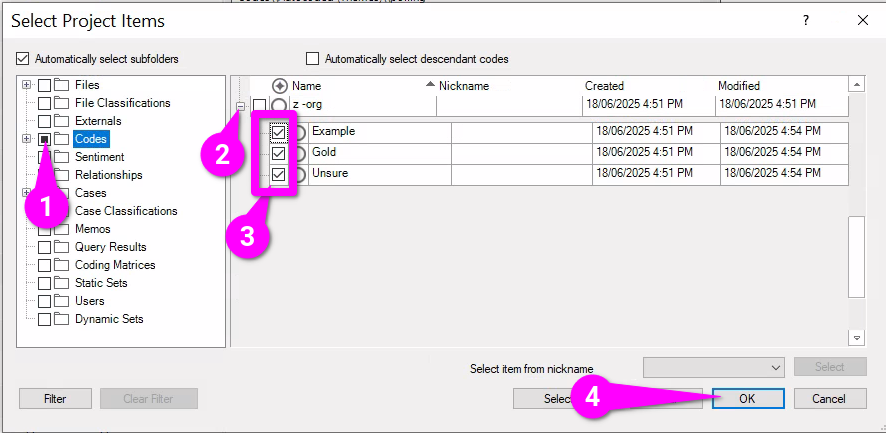 Within the ‘Select Project Items’ dialogue, select the three codes you picked: