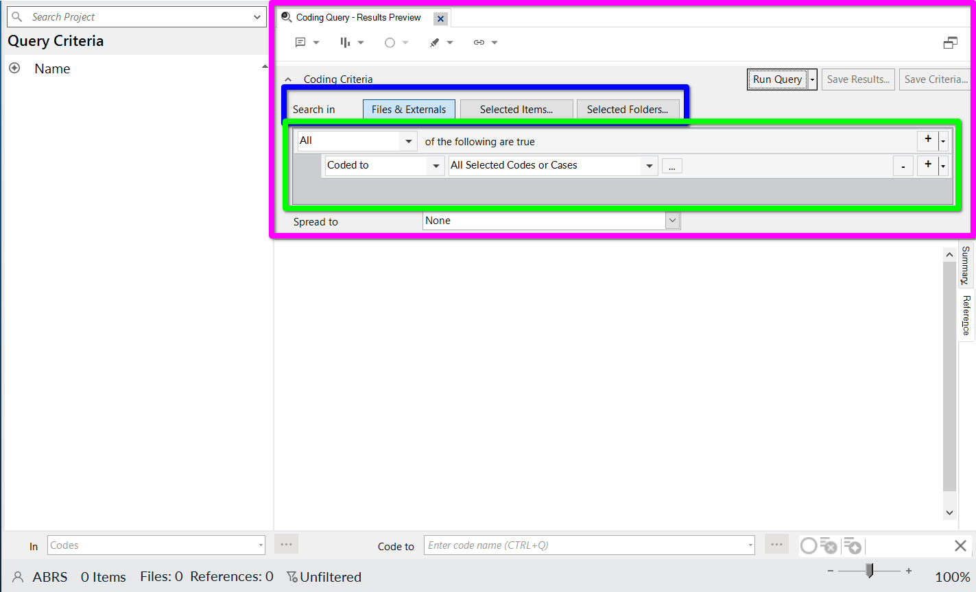 This will open a new tab for creating a Coding Query. Similar to when creating Dynamic Sets in the Advanced view, we have ‘Search in’ options to limit our query to specific files, items, or folders (in blue). We also have rows for our search criteria (in green).