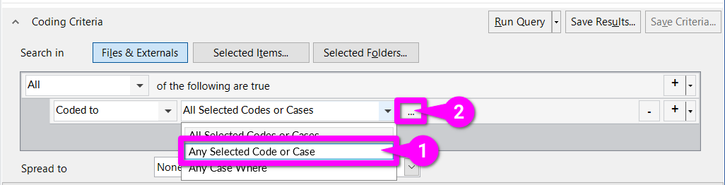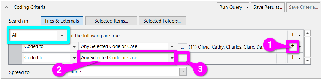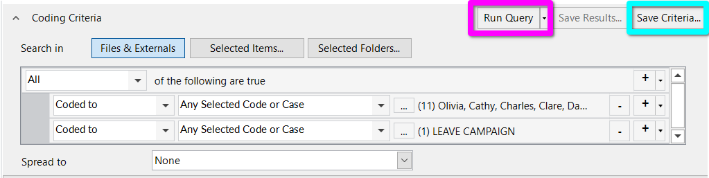 By default a new Coding Query is set to return ‘All’ (in light blue) coded sections that meet the listed criteria. So, all we need to do now is add another criteria for our ‘LEAVE CAMPAIGN’ code.