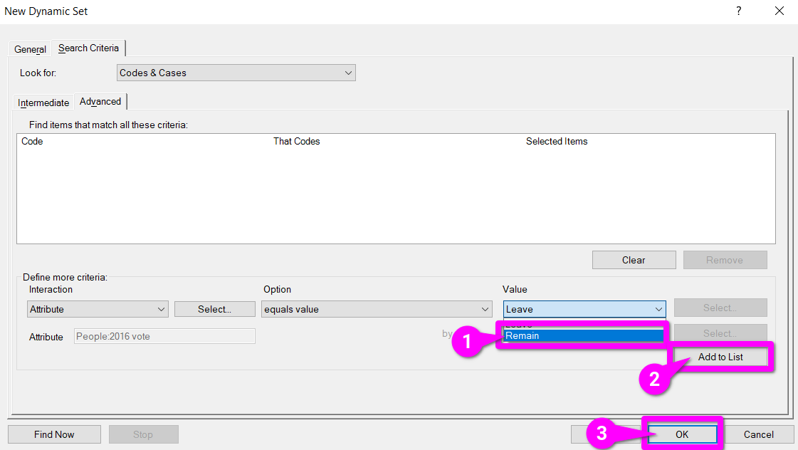 So, our next question was finding all our interview participants who support Remain the EU Referendum. As it is similar steps to follow, a shortened version of the instructions are included below.