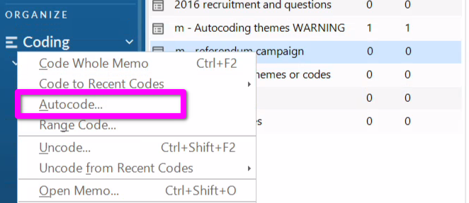 Most of the ‘advanced’ features within NVivo can be used and combined in various ways. As another example of how flexible some of NVivo’s features are let’s look at how we can autocode memos just like how we used it in the ‘Start Coding’ section for auto-coding interview and focus group transcripts.