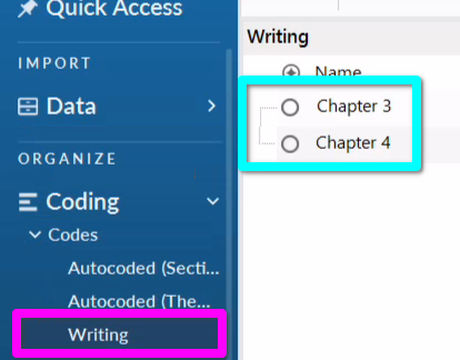 Another way to use codes for organising is having codes to store excerpts you intend to use - or have already used - in specific articles or thesis chapters. These can be combined with queries to facilitate finding relevant excerpts when writing. A Matrix Coding Query - which we will cover next - can be used to quickly show excerpts coded as each of your main codes and your writing organisation codes.