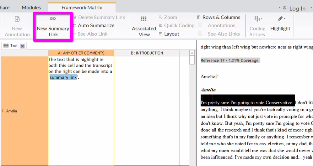Summary links are a framework matrix equivalent to memo see-also links. A summary link links text within a framework matrix cell to text within the transcript it is summarises from.